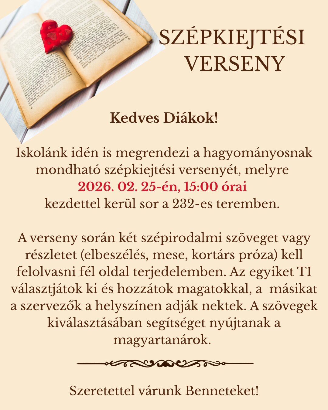 Idén is - a hagyományoknak megfelelően - megtartottuk az iskolai szavalóversenyt, amit most Nem volt egyszerű a zsűri dolga! Gratulálunk a helyezetteknek: Dombay Tímea (11.A) 1. helyezés, Készman Lili (11.G), Kovács Fruzsina (12.N) 2. helyezés, Fórizs Viktória Hanga (10.B) 3. helyezés