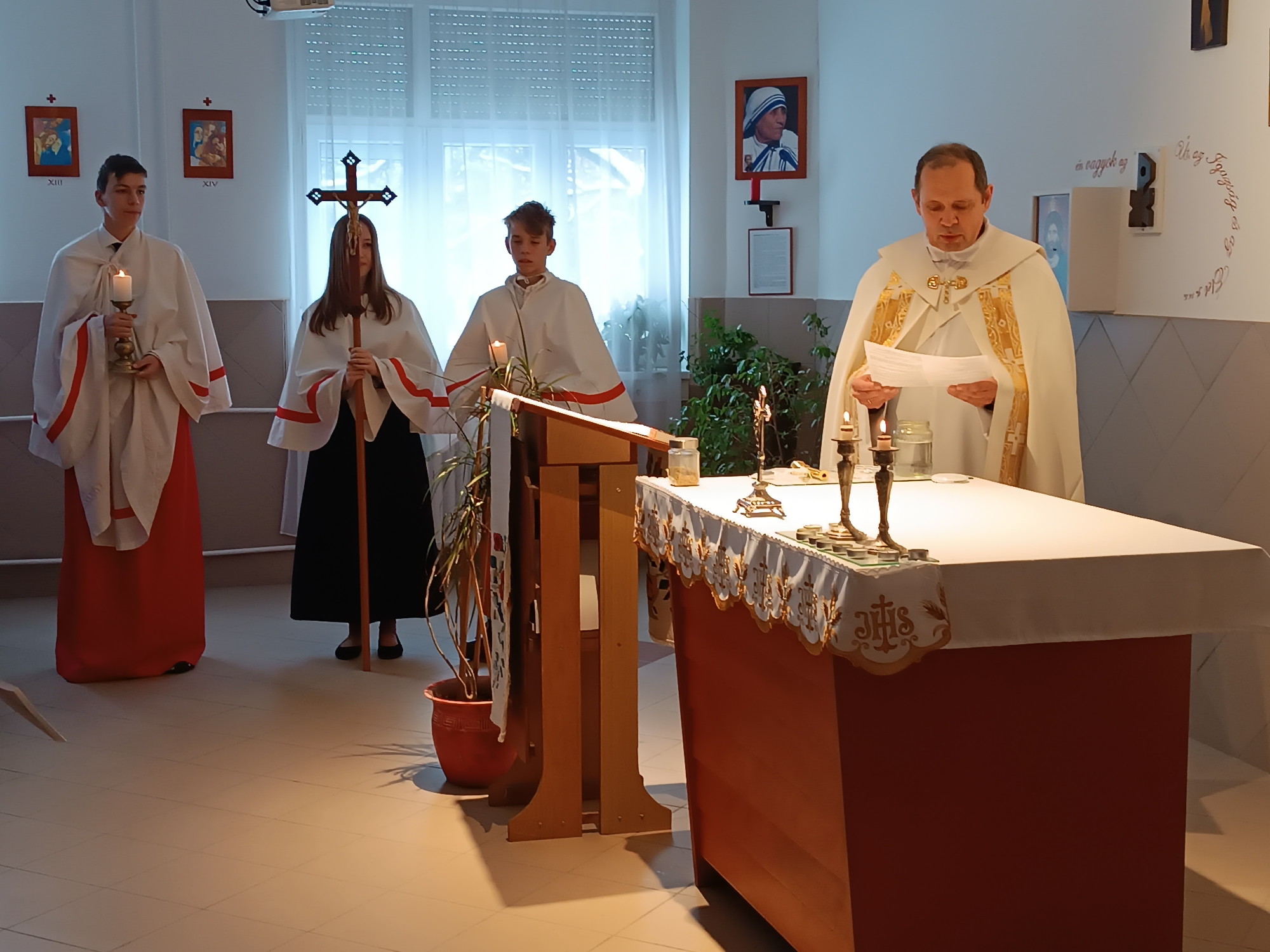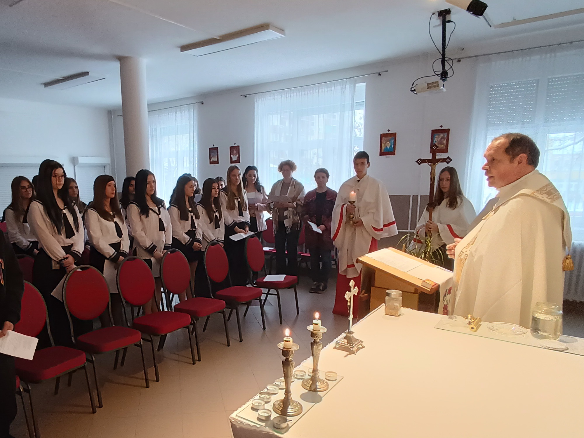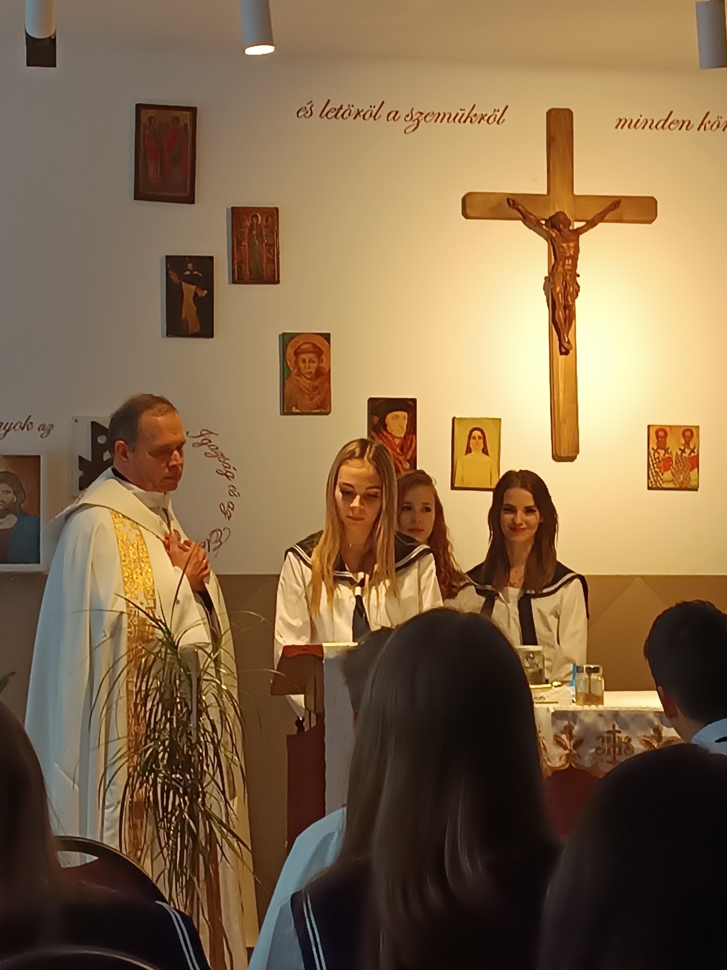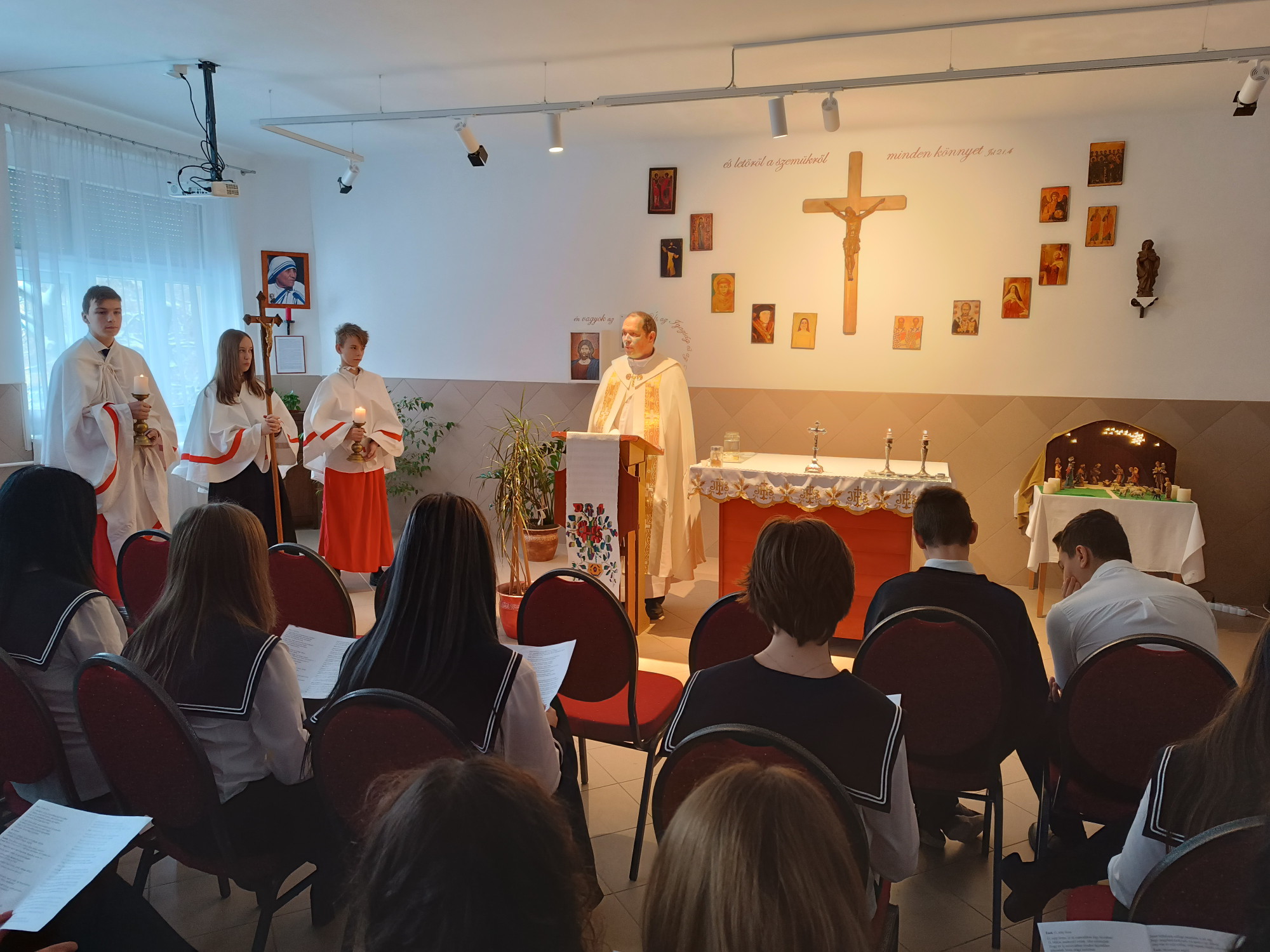 Mi is csatlakoztunk a világegyházban zajló, Csütörtökön a 7. órában közösen imádkoztuk a rózsafűzért az iskola kápolnájában. Az előimádkozókon kívül is több tanár részt vett és