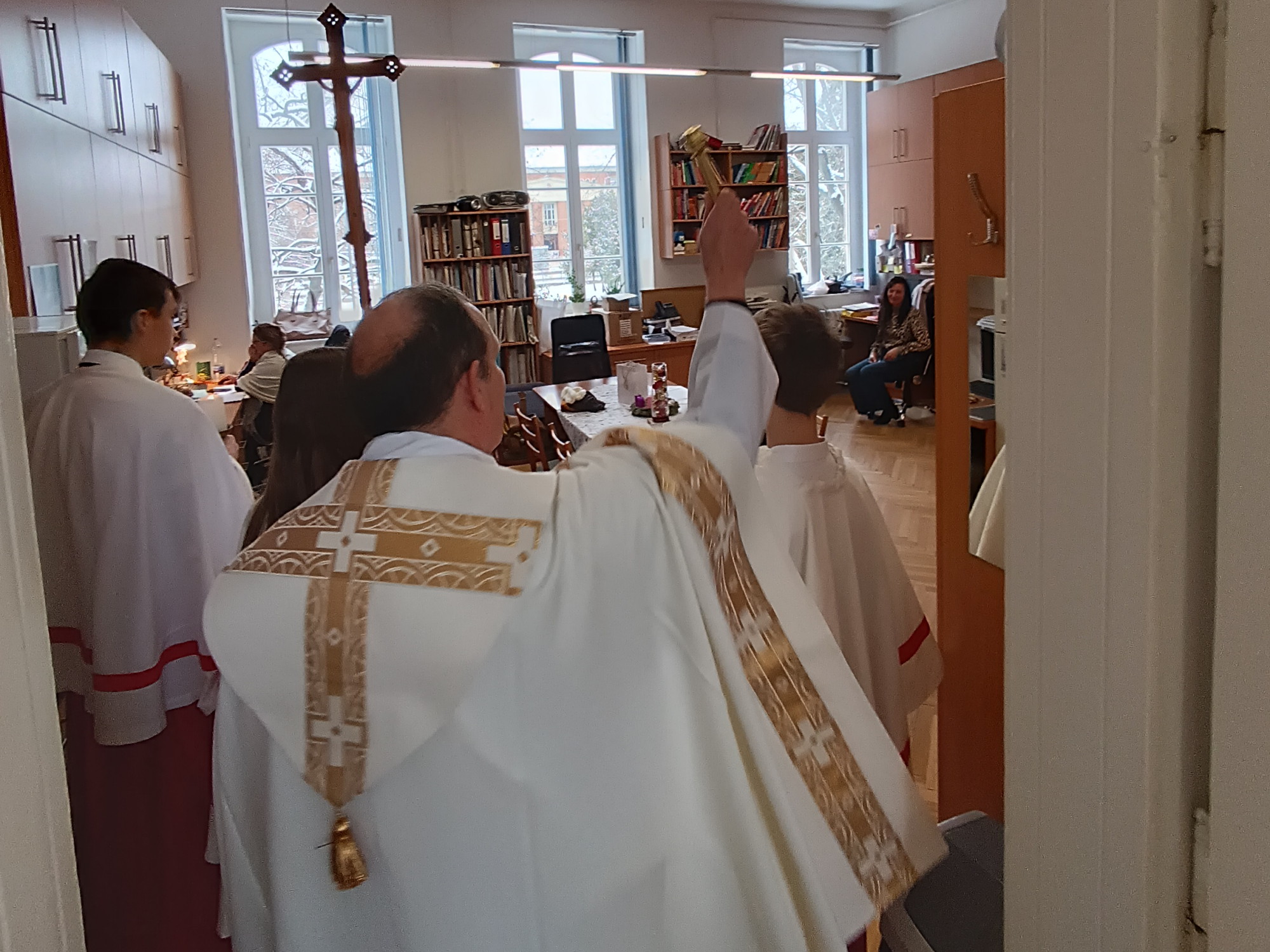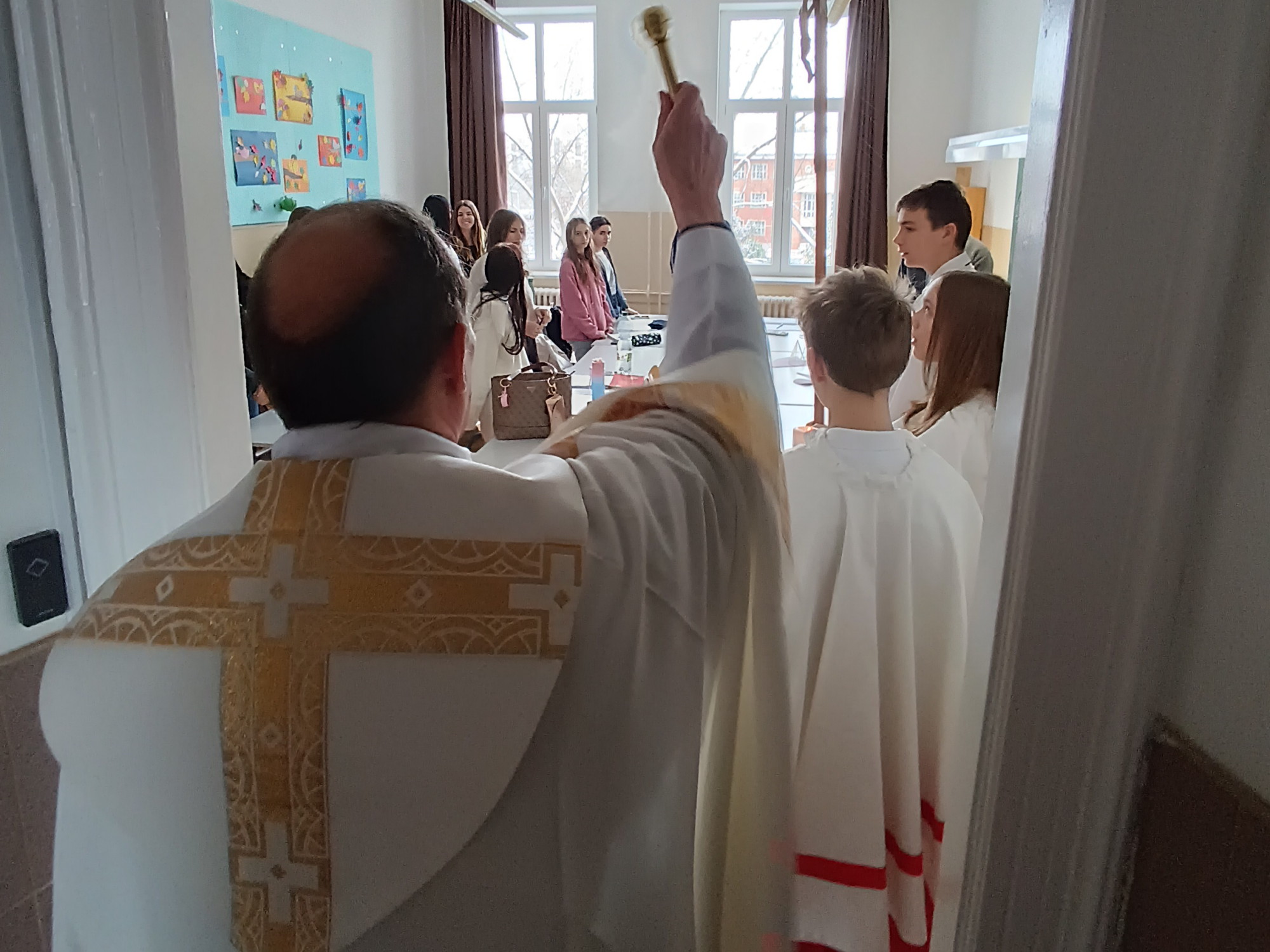Kezdődik a 2026. év (január 6. kedd 3. óra): iskolaszentelés. 2 0 + C + M + B + 2 6 Christus Mansionem Benedicat! + Krisztus áldja meg ezt a házat! Köszönjük a 9/Ny.N osztály (Virág Nikoletta tanárnő) és a kórus (Himberger Judit tanárnő) segítségét a lebonyolításban!